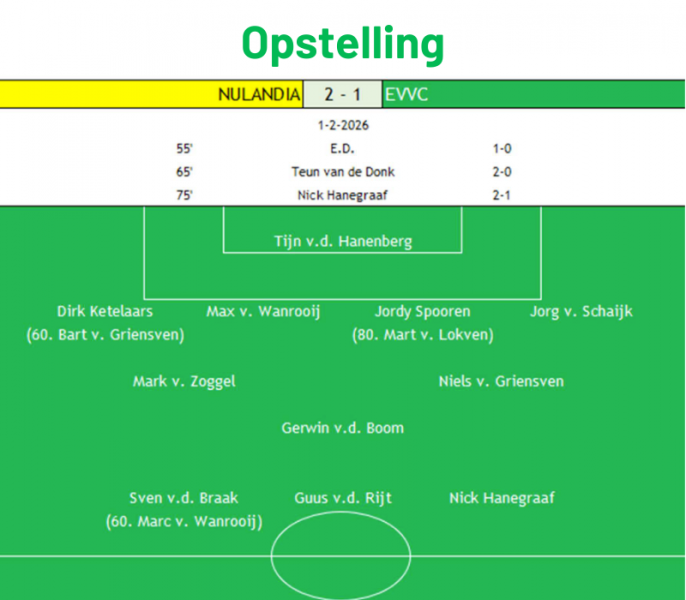 EVVC beleeft een teleurstellende middag in Nuland. Het brengt simpelweg te weinig en gaat met 2-1 onderuit in deze derby. De eerste helft gaat gelijk op zonder doelpunten, maar in de tweede helft beslissen twee snelle Nulandse treffers het duel. Via Nick Hanegraaf komt EVVC nog terug, maar in de buurt van de gelijkmaker komt het uiteindelijk niet.