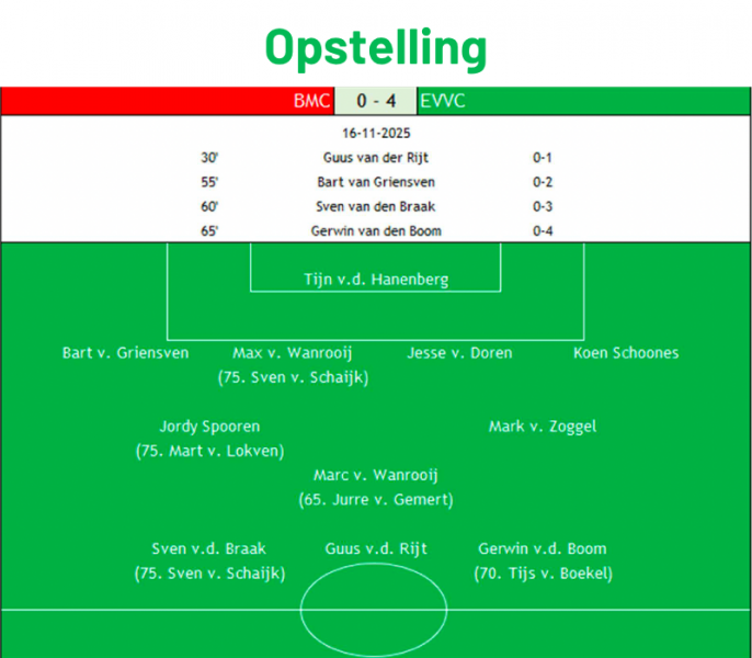 EVVC behaalt een overtuigende derbyzege op BMC: 0-4. Het is de gehele wedstrijd de betere en drukt dat vooral in het eerste deel van de tweede helft uit in doelpunten. De 0-1 ruststand wordt in korte tijd uitgebreid naar 0-4, waarna het een gewonnen wedstrijd speelt. De jeugdige thuisploeg uit Berlicum heeft in de eerste helft nog wel de grootste kans op de openingstreffer, maar kan in de rest van het duel geen enkele vuist maken. Het periodekampioenschap werd deze middag elders beslist, maar EVVC behoudt de aansluiting met de kopgroep.