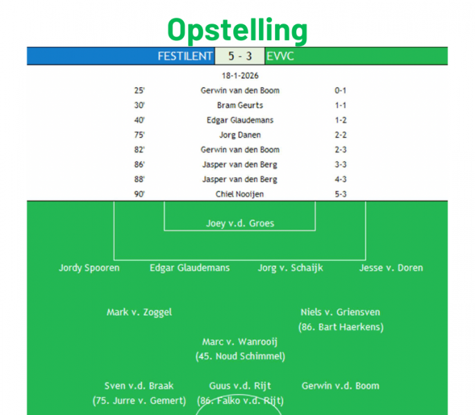Door het winterse weer kun je nauwelijks van een voorbereiding spreken richting de herstart van de competitie, maar EVVC begint toch sterk aan het duel. Festilent laat de bezoekers aan de bal, en EVVC gaat daar prima mee om. Aanvallen over de rechterkant leveren aardige kansen op voor Sven van den Braak, maar die kan net niet afronden. Ook Guus van der Rijt is nog kansrijk uit een slim genomen vrije trap. Halverwege de eerste helft komt EVVC dan ook verdiend op voorsprong, en die goal is een waar kunststukje van Gerwin van den Boom. Na balwinst komt de aanvoerder vlak voor de middenlijn aan de bal, en ziet de keeper net iets voor zijn doel staan. Een prachtige trap van 60 meter en het staat 0-1, pure klasse. Na die goal komt Festilent wat meer in het spel, en verrassend snel ook weer op gelijke hoogte. Spits Bram Geurts wordt diep weggestoken en rondt af in de verre hoek: 1-1. Toch komt EVVC nog voor rust weer op voorsprong. Na een afgeslagen bal is Marc van Wanrooij sterk in het duel en brengt de bal terug voor het doel. Daar is verdediger Edgar Glaudemans