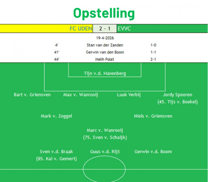 Eén wijziging vandaag bij EVVC: Jorg van Schaijk brak ongelukkig zijn pols tegen BMC en wordt vervangen door de van een schorsing terugkerende Max van Wanrooij. EVVC is vandaag al bijtijds in Uden om het tweede elftal aan te moedigen richting het kampioenschap. In een rechtstreeks duel met de enig overgebleven concurrent FC Uden 2 wordt overtuigend de dik verdiende titel binnen gesleept: 1-3.
