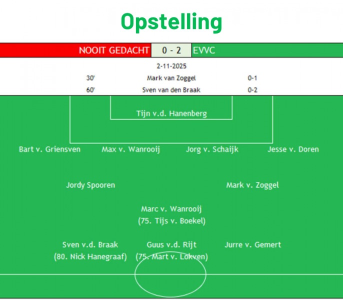 Zo beleeft EVVC een mooie revanche voor de teleurstellende wedstrijd tegen Prinses Irene. Nu blijkt Nooit Gedacht sowieso een prettige tegenstander voor EVVC: de laatste 10 ontmoetingen in competitieverband eindigden in 8 Vinkelse zeges en 2 gelijkspellen (doelsaldo 23-4). De uitslagen van dit weekeinde zorgen ervoor dat de top van de competitie weer dichtbij elkaar kruipt. EVVC stijgt naar plek vier, met slechts één puntje achterstand op koplopers Prinses Irene en Volkel. Een volgende derby is in deze competitie nooit ver weg, en dat is komend weekend wederom een fraaie als Heeswijk op bezoek komt in Vinkel. Een tegenstander die na een matige start aardig in vorm is geraakt, en inmiddels één plekje onder EVVC staat op de ranglijst. Ook de volgende derbykraker is er dus weer eentje om naar uit te kijken.