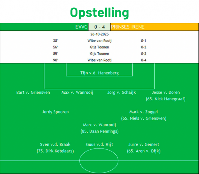 In de tweede helft heeft het dan ook wat te herstellen, maar de volgende domper volgt al snel. Een hoekschop van Gijs Toonen valt gevangen door de wind zomaar bij de eerste paal binnen, waar EVVC bepaald niet goed staat. Al vroeg in de wedstrijd gaat EVVC met een drietal wissels over op een allesof- niets offensief. Bijna levert dat al snel resultaat op als Nick Hanegraaf met een geweldige steekbal Sven van den Braak vrij voor het doel zet. Zijn schot wordt opnieuw knap gepakt door de doelman en ook in de rebound is het niet raak. Uiteindelijk is het vooral Prinses Irene dat profiteert van de ruimte en in de absolute slotfase mag uitlopen naar een grote uitslag. Een moegestreden en machteloos EVVC ziet toe hoe Gijs Toonen en Wibe van Rooij hun tweede van de middag maken en de eindstand op 0-4 zetten.