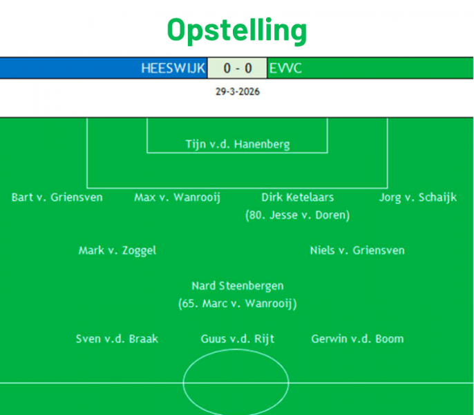 Zo is het bepaald geen enerverende middag in Heeswijk. Positief voor EVVC is dat het voor het eerst sinds de winterstop weer een punt haalt in een uitwedstrijd, maar dat is niet genoeg om een stap op de ranglijst te maken. Volgende week komt hekkensluiter BMC op bezoek in Vinkel voor de volgende derby. Eerder in Berlicum won EVVC nog overtuigend met 0-4, maar de laatste weken is BMC toch aardig wat punten gaan pakken.
