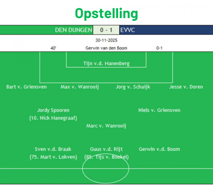 EVVC mazzelt met minimale zege in Den Dungen: 0-1. Het is de thuisploeg die de wedstrijd voetballend domineert, maar dat niet in doelpunten weet uit te drukken. EVVC doet dat wel in een sterke fase voor rust, waar het wel erg veel geluk heeft dat een hoekschop van Gerwin van den Boom door een Dungense verdediger in eigen doel wordt verlengd. Richting het einde van de wedstrijd is het hangen en wurgen, maar eindelijk weet het eens punten te pakken in Den Dungen.