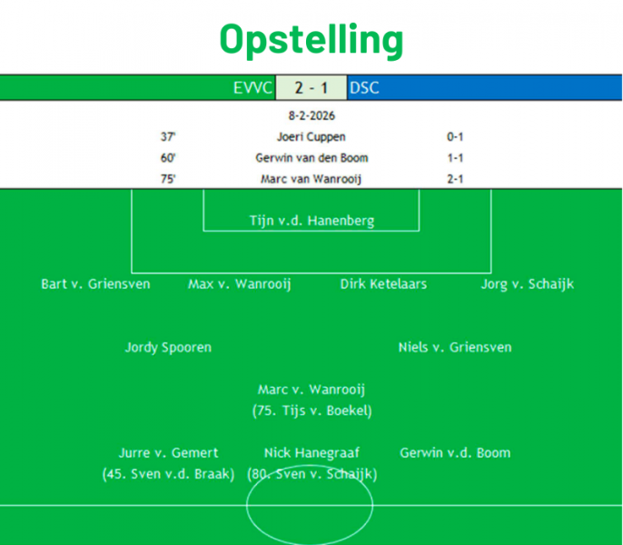 EVVC sluit de serie wedstrijden tot de carnaval positief af met een zwaarbevochten thuisoverwinning op DSC: 2-1. Vlak voor rust komt het uit een hoekschop nog op een 0-1 achterstand, maar in de tweede helft dringt het succesvol aan. Een penalty van Gerwin van den Boom en een doelpunt van Marc van Wanrooij brengen EVVC alsnog de belangrijke overwinning.