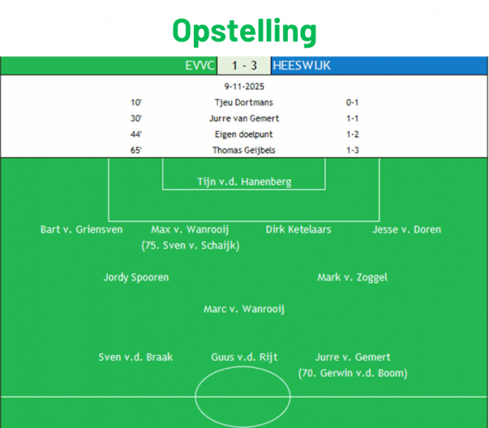 EVVC gaat met 1-3 onderuit tegen Heeswijk en verliest opnieuw een derby in eigen huis. De bezoekers uit Heeswijk zijn de sterkere in een wedstrijd met veel strijd en inzet. Dankzij het eerste doelpunt in EVVC 1 van Jurre van Gemert lijkt EVVC een slechte start en vroege tegentreffer nog te boven te komen, maar vlak voor rust komt het heel ongelukkig opnieuw op achterstand. In de tweede helft countert Heeswijk naar de beslissing, terwijl EVVC geen vuist weet te maken.